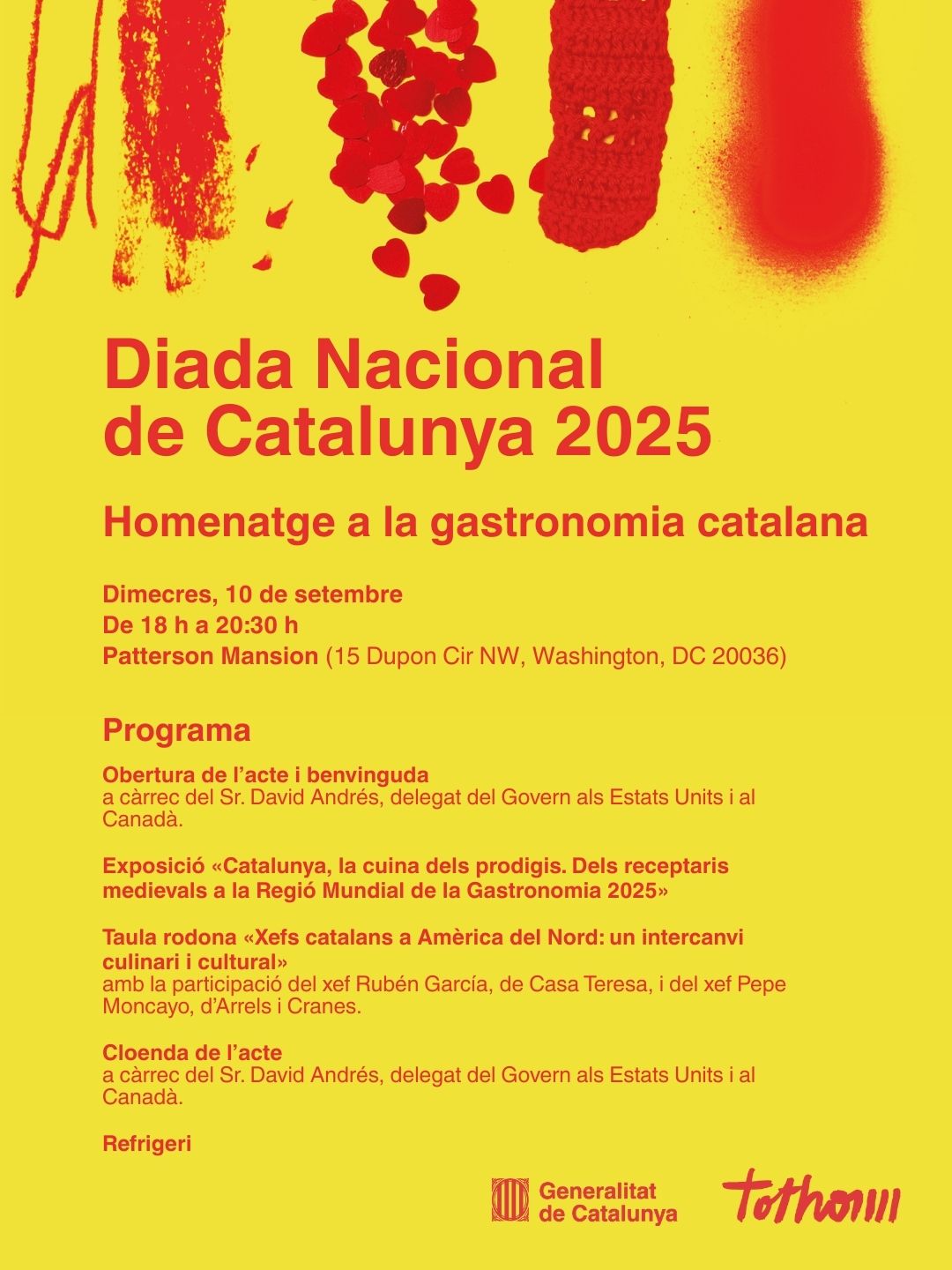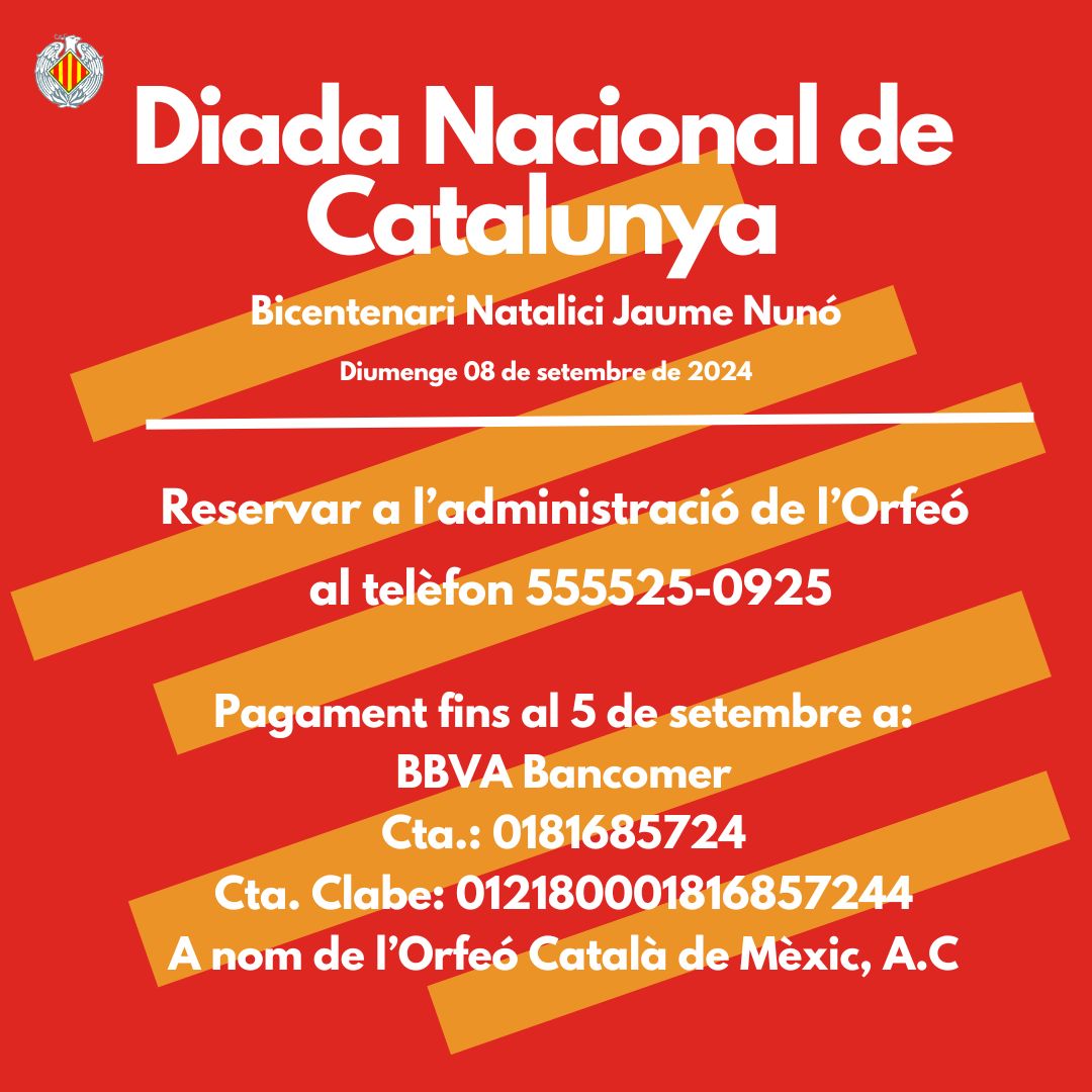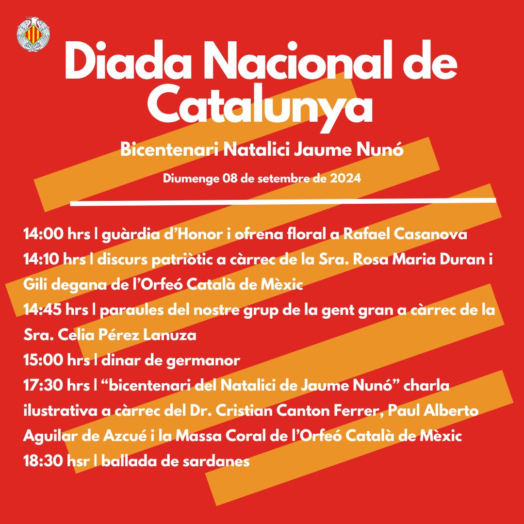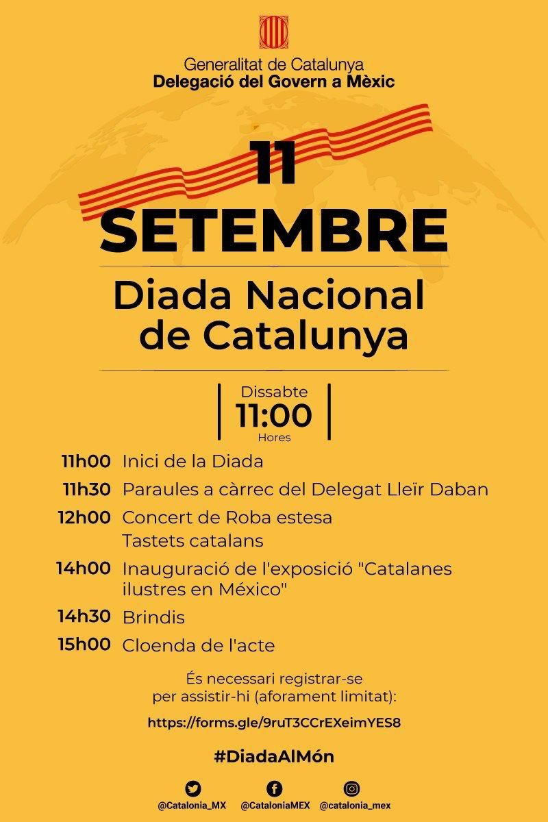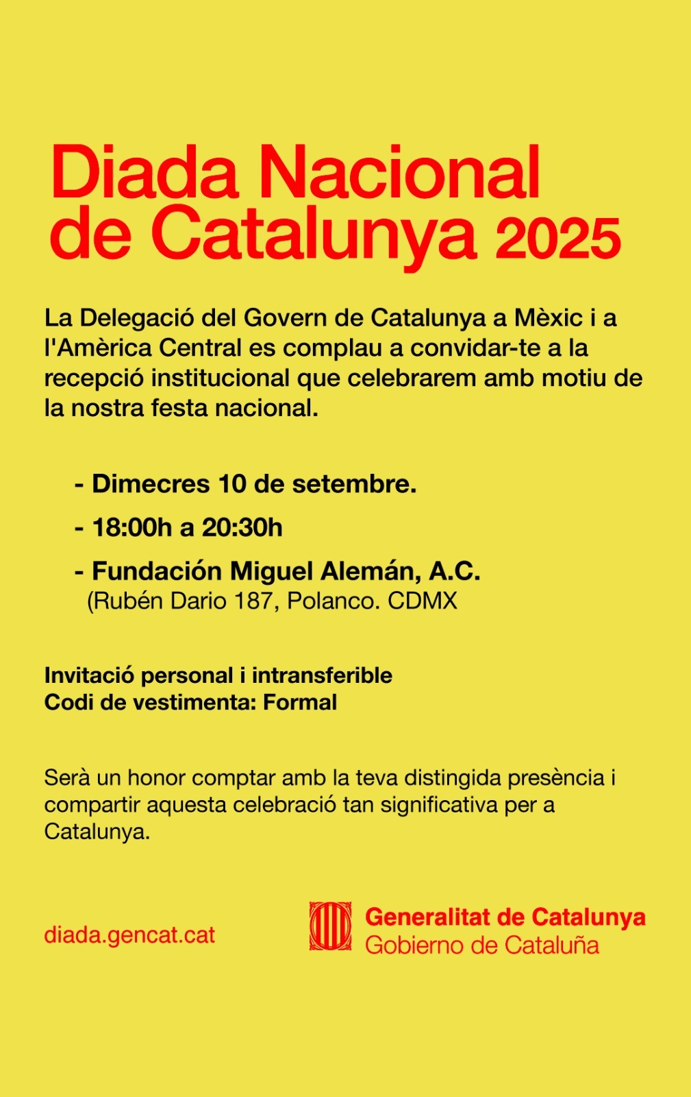 (El delegat del Govern a Mèxic i a l'Amèrica Central es complau a convidar-te a la recepció institucional que celebrarem amb motiu de la nostra festa nacional. Dimecres 10 de setembre. 18:00h a 20:30h Fundación Miguel Alemán A.C. (Rubén Darío 187, Polanco CDMX). Serà un honor comptar amb la teva presència! Confirma la teva assistència: https://lu.ma/zg1p5dds)