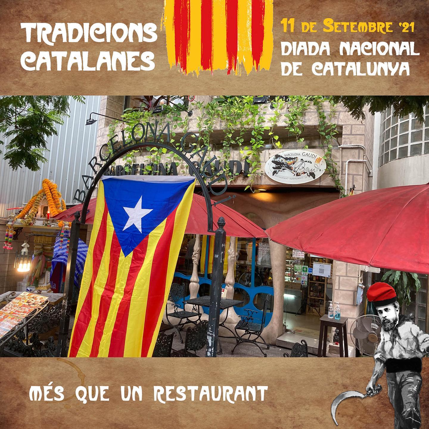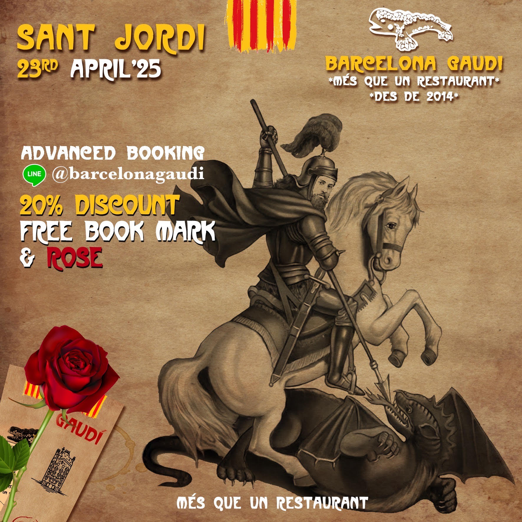(Vine a celebrar la diada amb nosaltres!! Barcelona Gaudi Restaurant, celebrant les tradicions Catalanes des del 2014 i sent l'unic Restaurant Català del pais. 20% de descompte a totes les reserves* Regals per tots: PUNTS DE LLIBRE i ROSES *LINE official: @barcelonagaudibkk 02-661-7410 "Estimar la cultura es compartir-la")