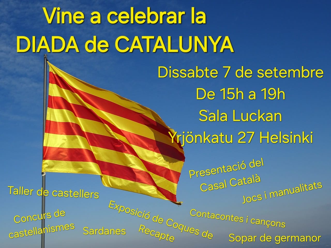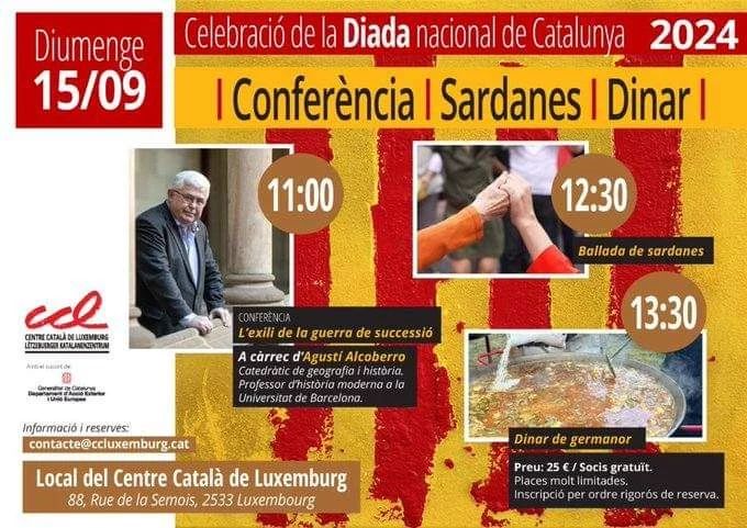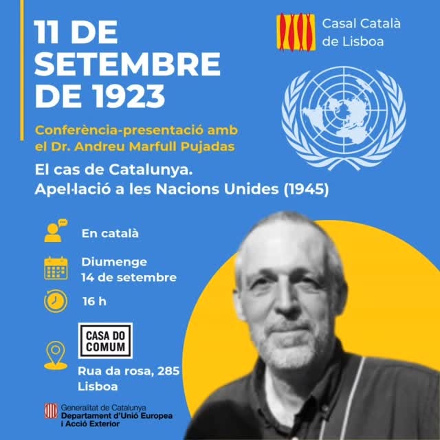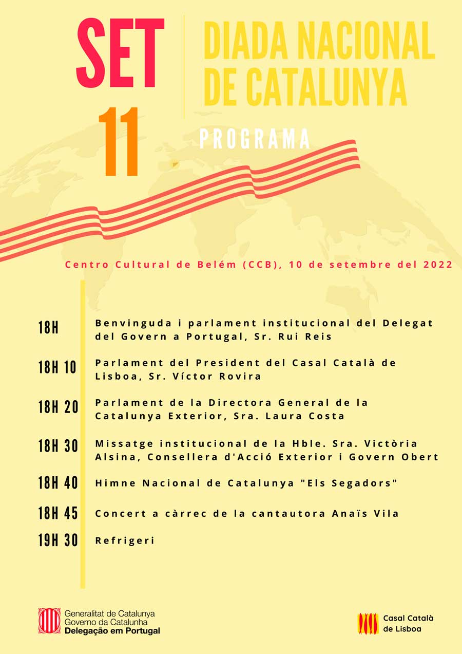 (Us convidem a celebrar la Diada d'enguany amb el Casal Català de Lisboa i la Delegació del Govern de Catalunya a Portugal. Ens agradaria molt que vinguessiu. Será un acte cultural amenitzat amb cava i pica-pica de productes catalans. Agraïm que ens confirmeu l'assistència enviant un mail a l'adreça casalcataladelisboa@gmail.com Us hi esperem!)