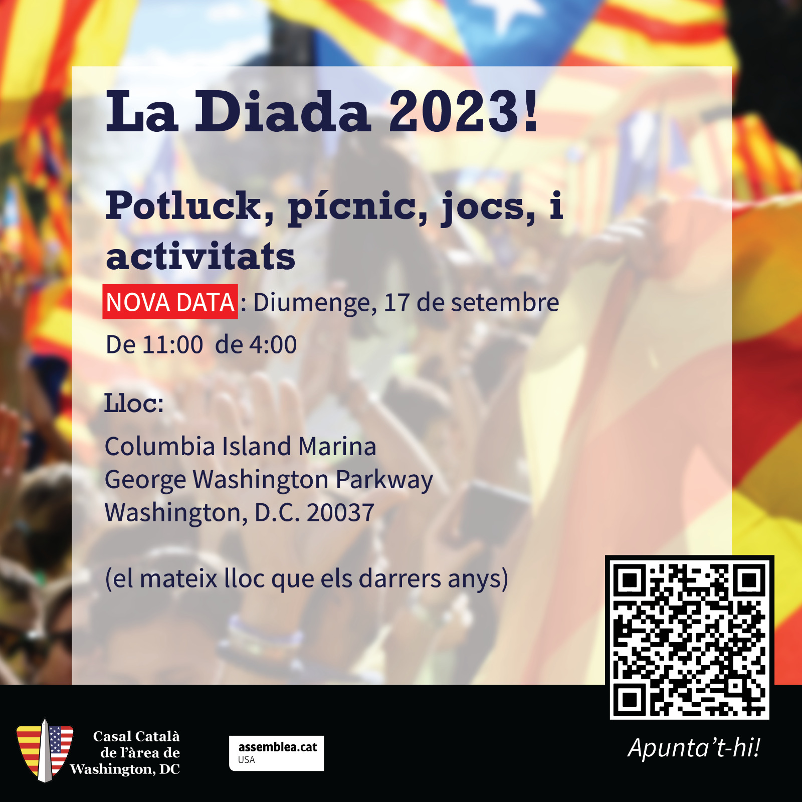 (Celebra la Diada Nacional de Catalunya amb la ANC USA i un objectiu en ment: la independència! Celebrate Catalan National Day with your friends at ANC USA and an objective in mind: Independence!)