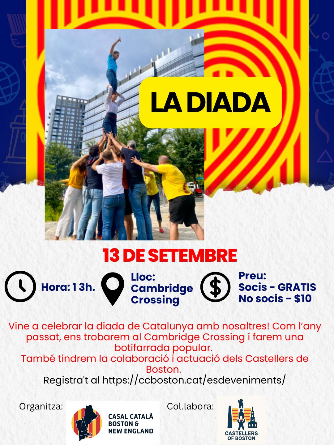 (Us animem a apuntar-vos a una activitat doble per celebrar la Diada de Catalunya. En primer lloc, el dissabte dia 13 de setembre, de les 13 del matí, a les 16, el Casal Català us convidem a una trobada al Cambridge Crossing. Com sempre, hi tindrem neveres amb begudes no alcoholiques (hi ha la cerveseria Lampligher al costat de l'esdeveniment), entrepans, i graelles de carbó. Però això no és tot. Els Castellers ens visitaran i faran un pilar de germanor que no ens podem perdre!!! Aquesta trobada está organitzada pel Casal Català de Boston i New England. Per tant, està oberta a tots els Catalans i amics de Catalunya que hi vulguin participar. * El menjar serà gratuït per als que ja sou socis i $10 per als que encara no ho sou. També tindrem preparat un estand que permetrà fer-se soci al moment. Els diners recaptats seran destinats a subvencionar aquesta activitat i d'altres més endavant. )