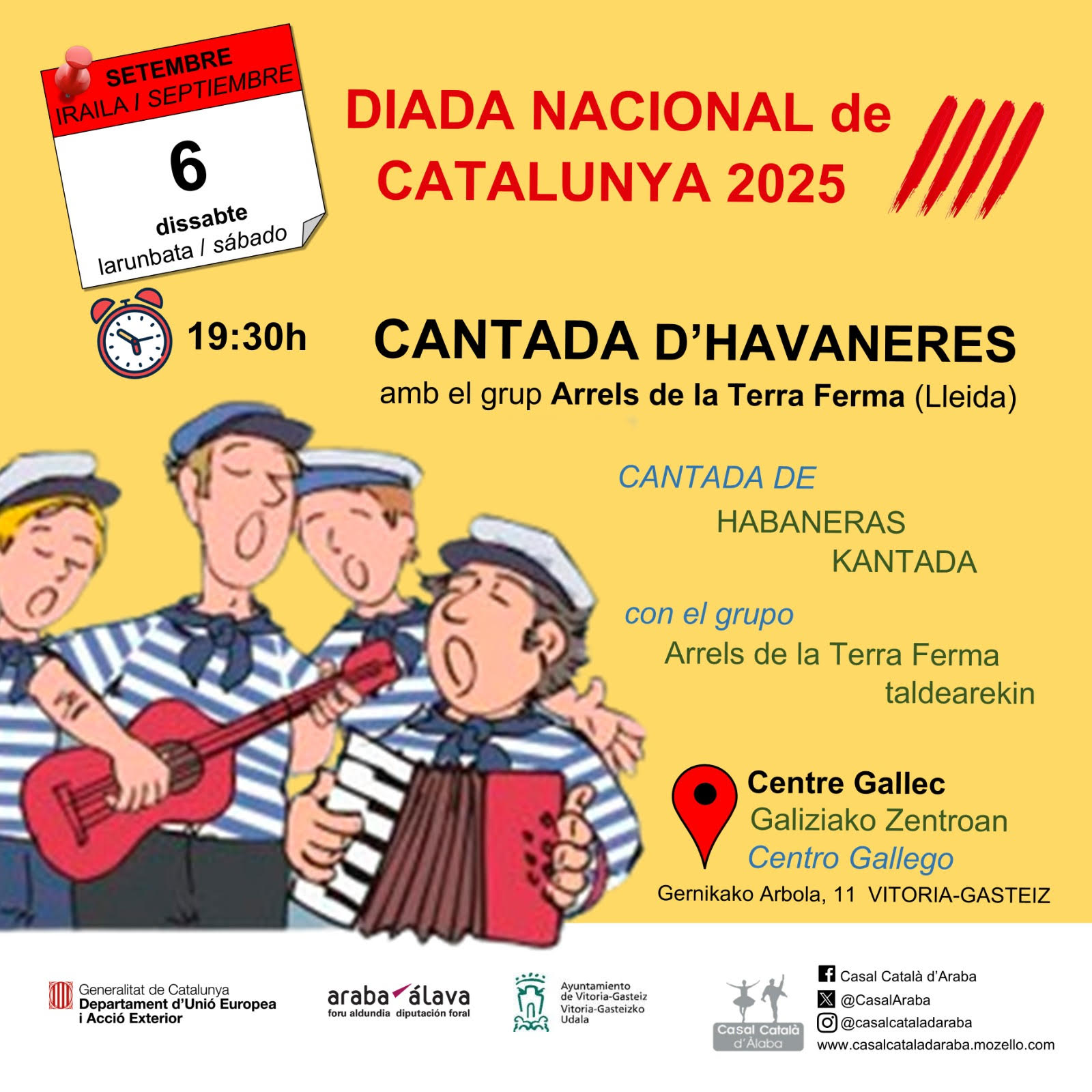 (Inauguració de les reformes del Casal i la nova sala d'actes. Acte institucional amb les presència dels anteriors presidents i de fundadors del Casal Seguiment dels actes de la Diada a Catalunya i parlamemts. La Coral Kem'bix cantarà el Cant del Oce:ls i Els Segadors.)