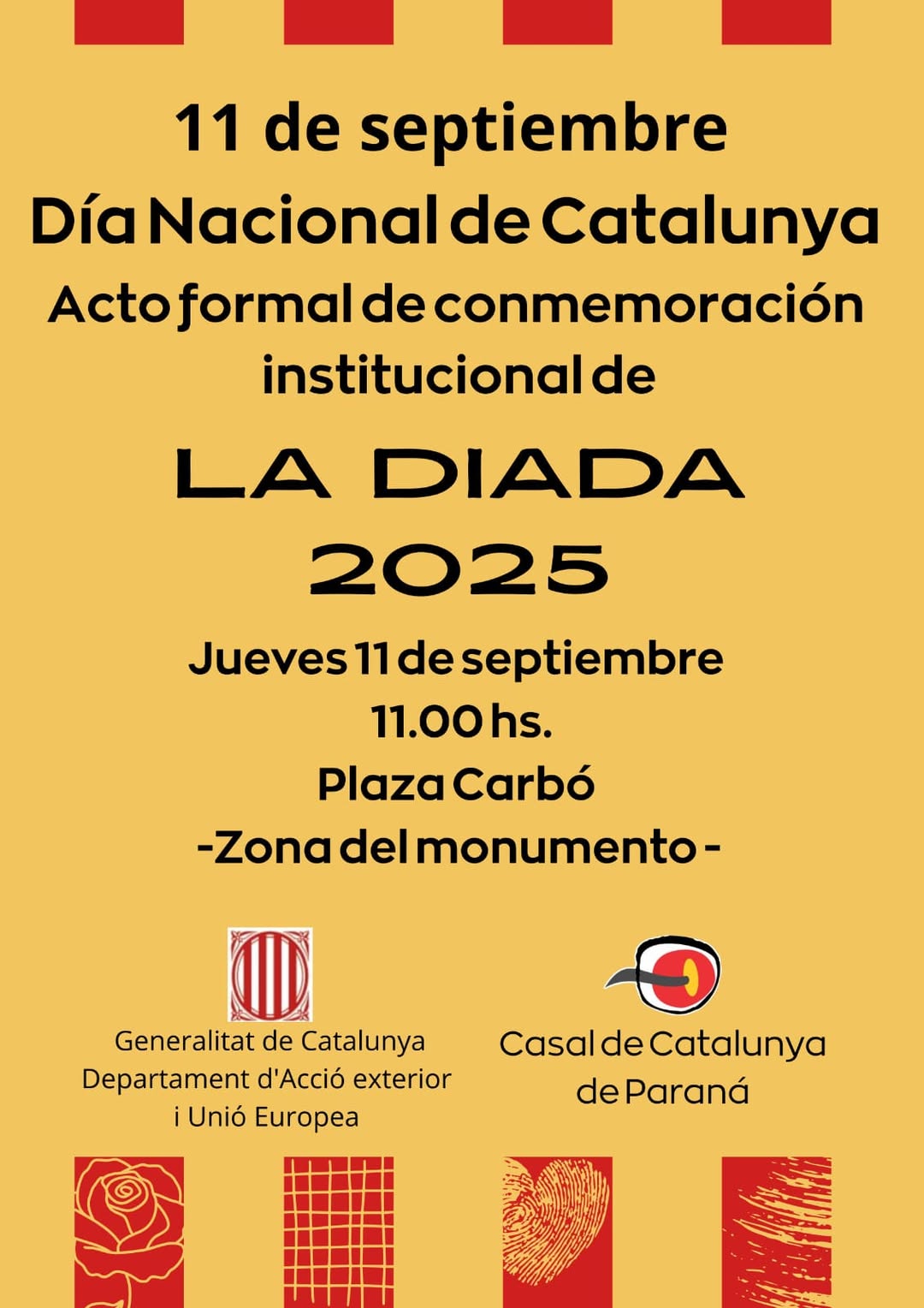 (Es fa un acte conmemoratiu amb presencia de autoritats Municipals, socis, i públic en general. Entean les banderes catalana i argentina, es cantan els dos himnos i es diuen unes paraules alusives a la Diada. Després ballada de sardanes i ofrena floral. A continuaciò a la seu del Casal s'ofereig una paella per als concorrents.)