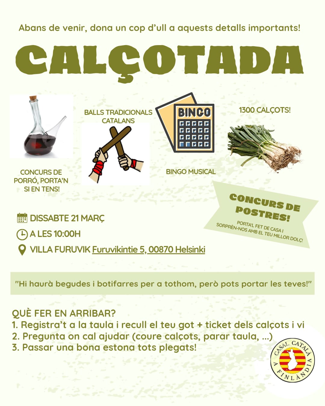 (La calçotada va ser fantàstica — moltes gràcies a tothom per venir amb tanta energia i ganes de gaudir! Un agraïment molt especial a totes i tots els que us vau arremangar i vau fer possible que tot sortís rodó, i també a les organitzadores per la gran feina 👏 Vam aconseguir coure 1300 calçots i 116 salsitxes! 🔥 Ens ho vam passar genial: vam riure, vam disfrutar del menjar i de la companyia.)