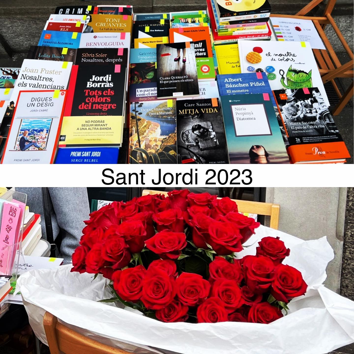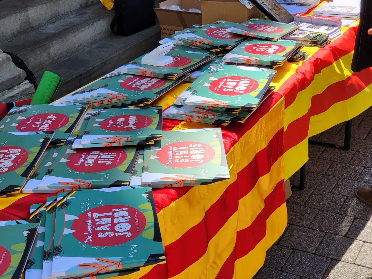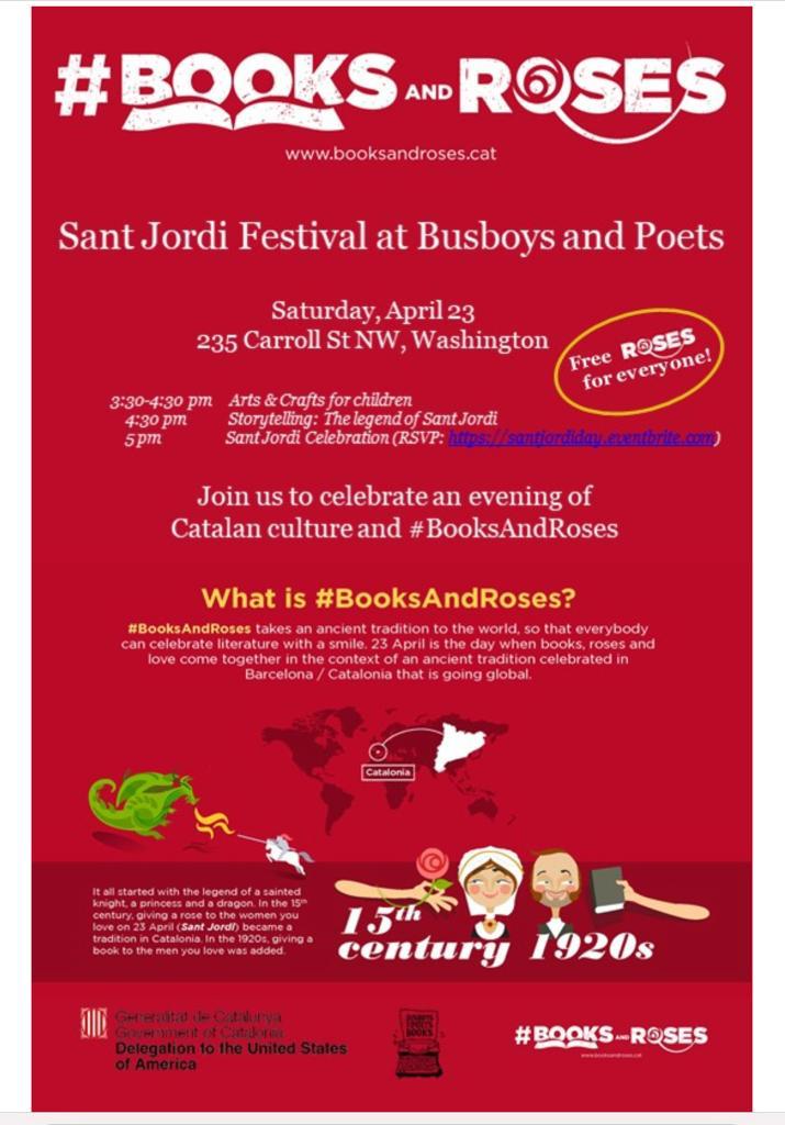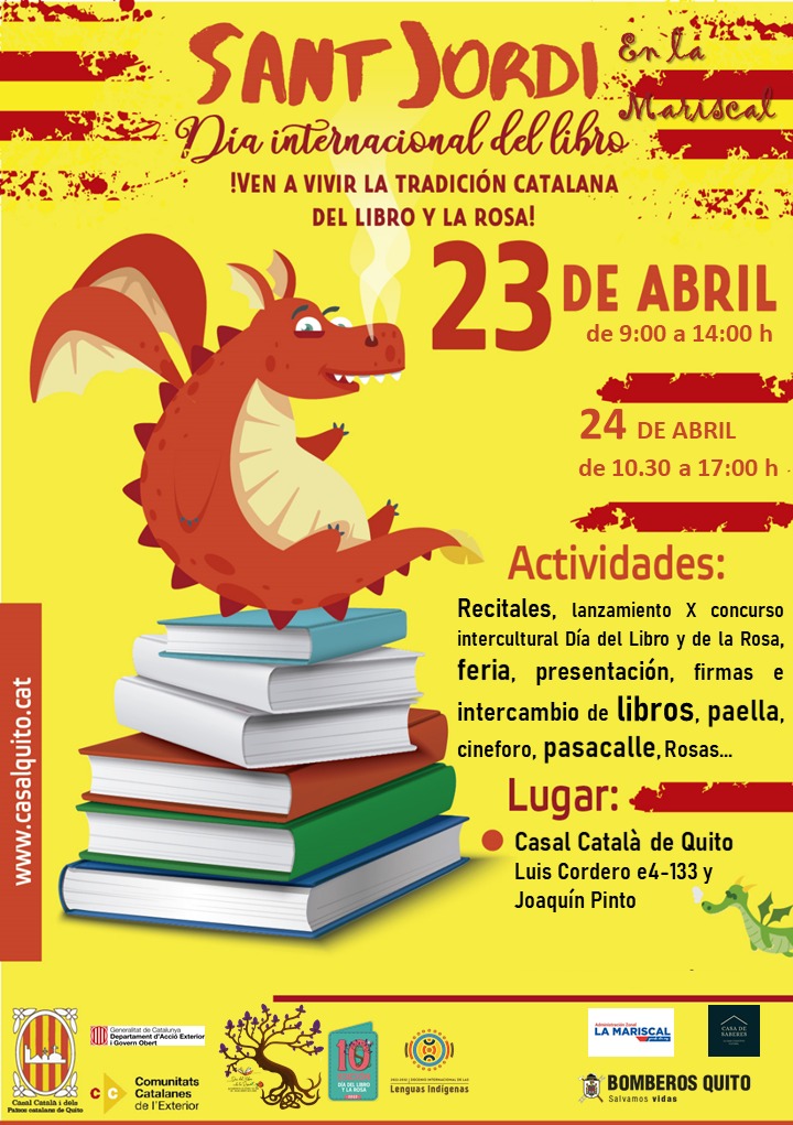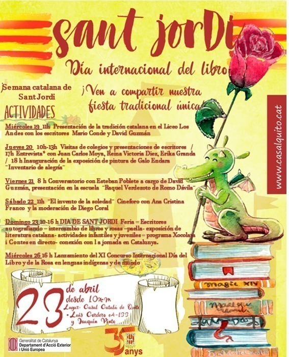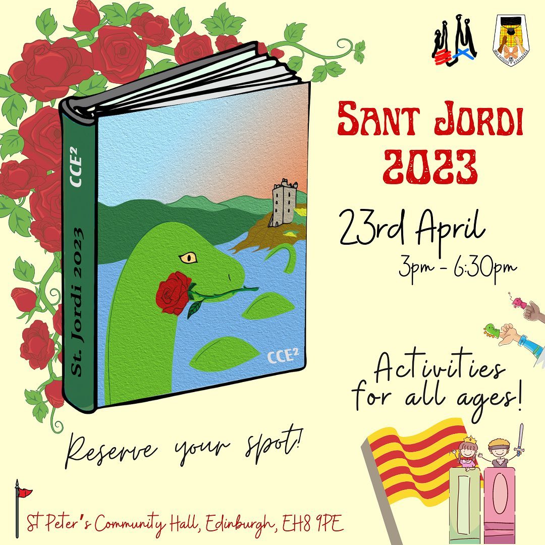 (Sant Jordi a Andorra la Vella! Sant Jordi també es celebra a Andorra amb una fira el dia 23 d’abril a la plaça de la Rotonda d’Andorra la Vella, amb llibres, roses i obsequis per als lectors més petits.)