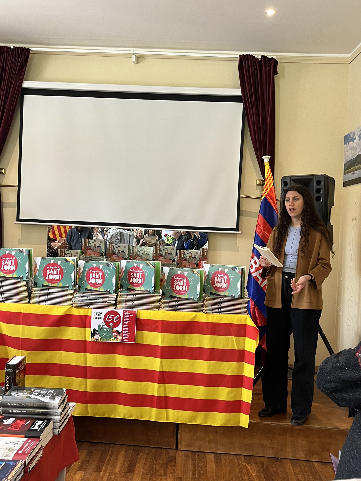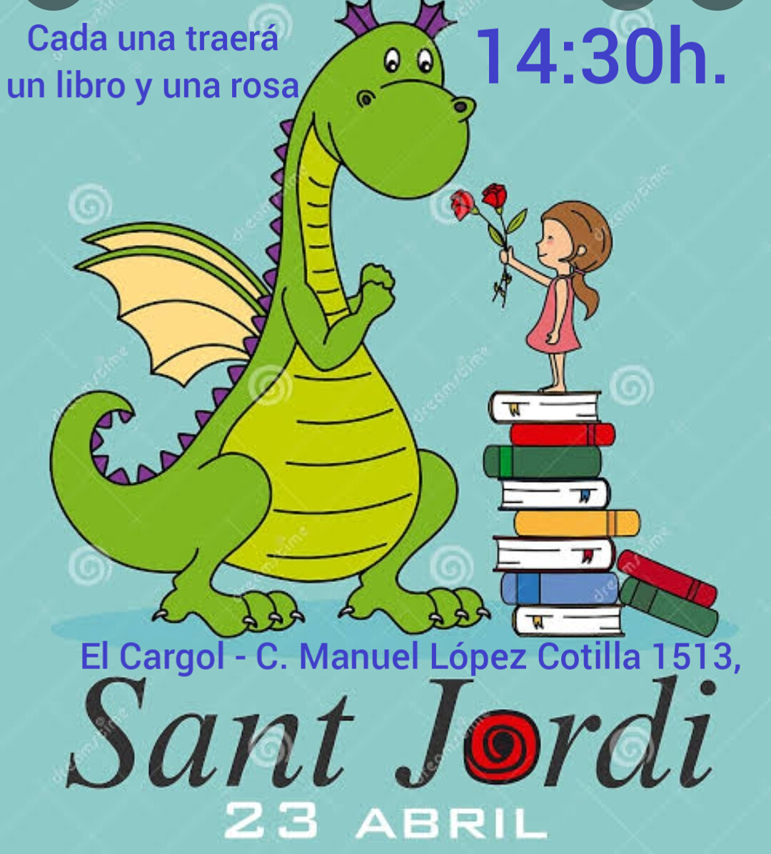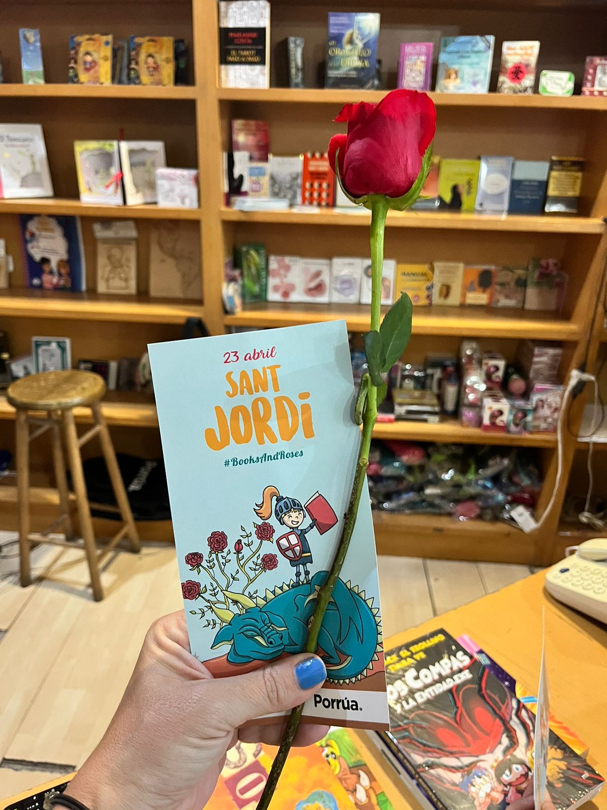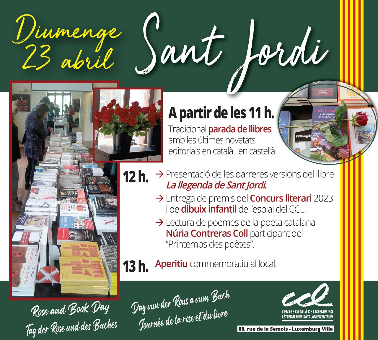 (Sant Jordi a Andorra la Vella! Sant Jordi també es celebra a Andorra amb una fira el dia 23 d’abril a la plaça de la Rotonda d’Andorra la Vella, amb llibres, roses i obsequis per als lectors més petits.)