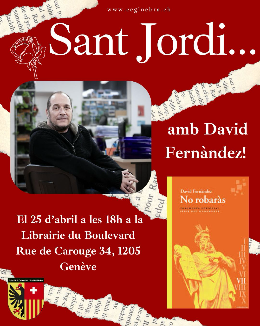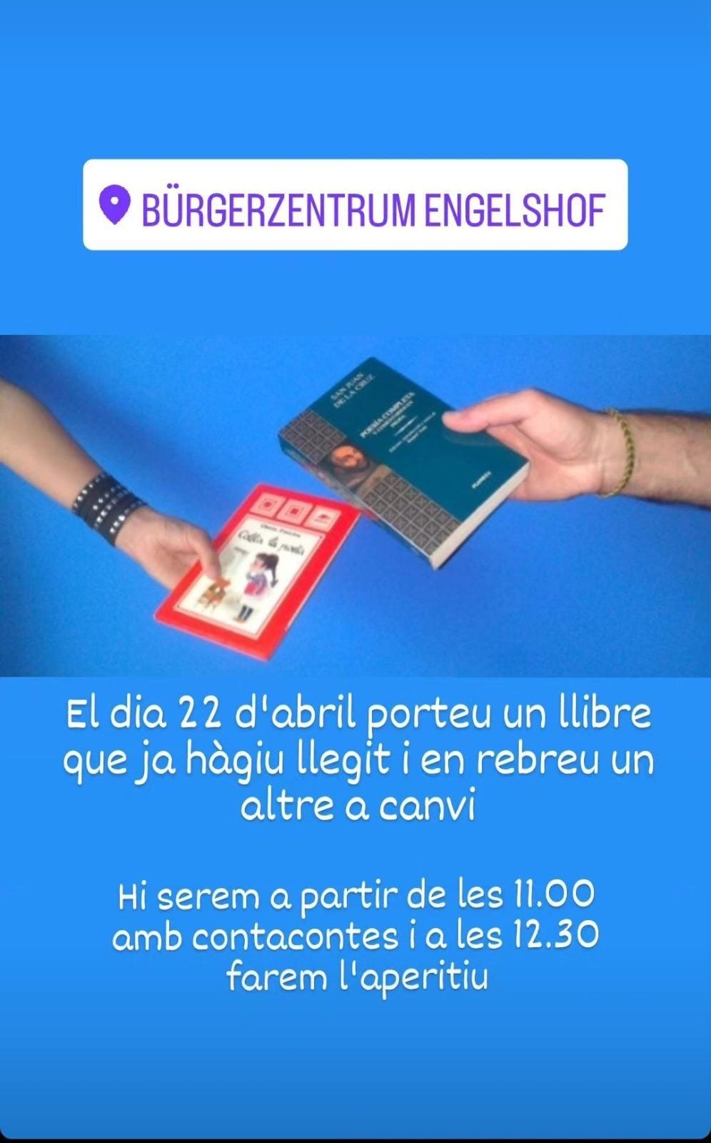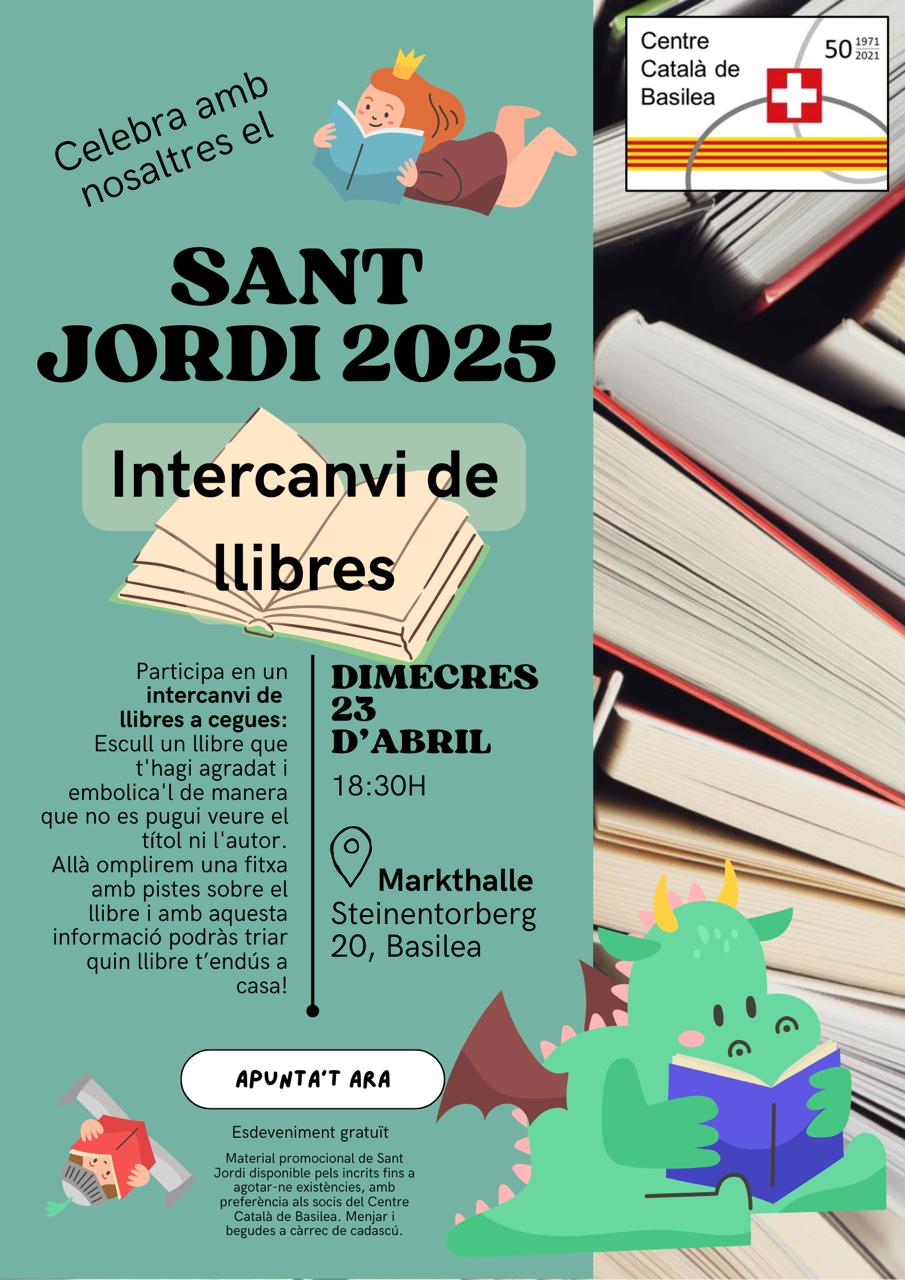 (Come and participate in a blind book exchange with the Centre Català de Basel (Catalan community in Basel). Celebra Sant Jordi d’una manera original i divertida! Vine al Markthalle i participa en un intercanvi de llibres a cegues. Com funciona? És molt senzill: Prepara un llibre: Escull un llibre que t’hagi agradat i que vulguis compartir. Embolica’l: Embolica el llibre de manera que no es pugui veure el títol ni l’autor. Fitxa amb pistes: Omplirem una fitxa allà mateix amb pistes sobre el llibre: gènere, temàtica, sensacions que transmet,etc. Per donar pistes a la persona que rebrà el teu llibre. Intercanvi: Intercanvia el teu llibre embolicat per un altre, basat en el la fitxa amb pistes, i descobreix noves lectures! Així, no només celebraras Sant Jordi, sino que també descobriràs nous llibres i coneixeràs a gent del Casal Català de Basilea.)
