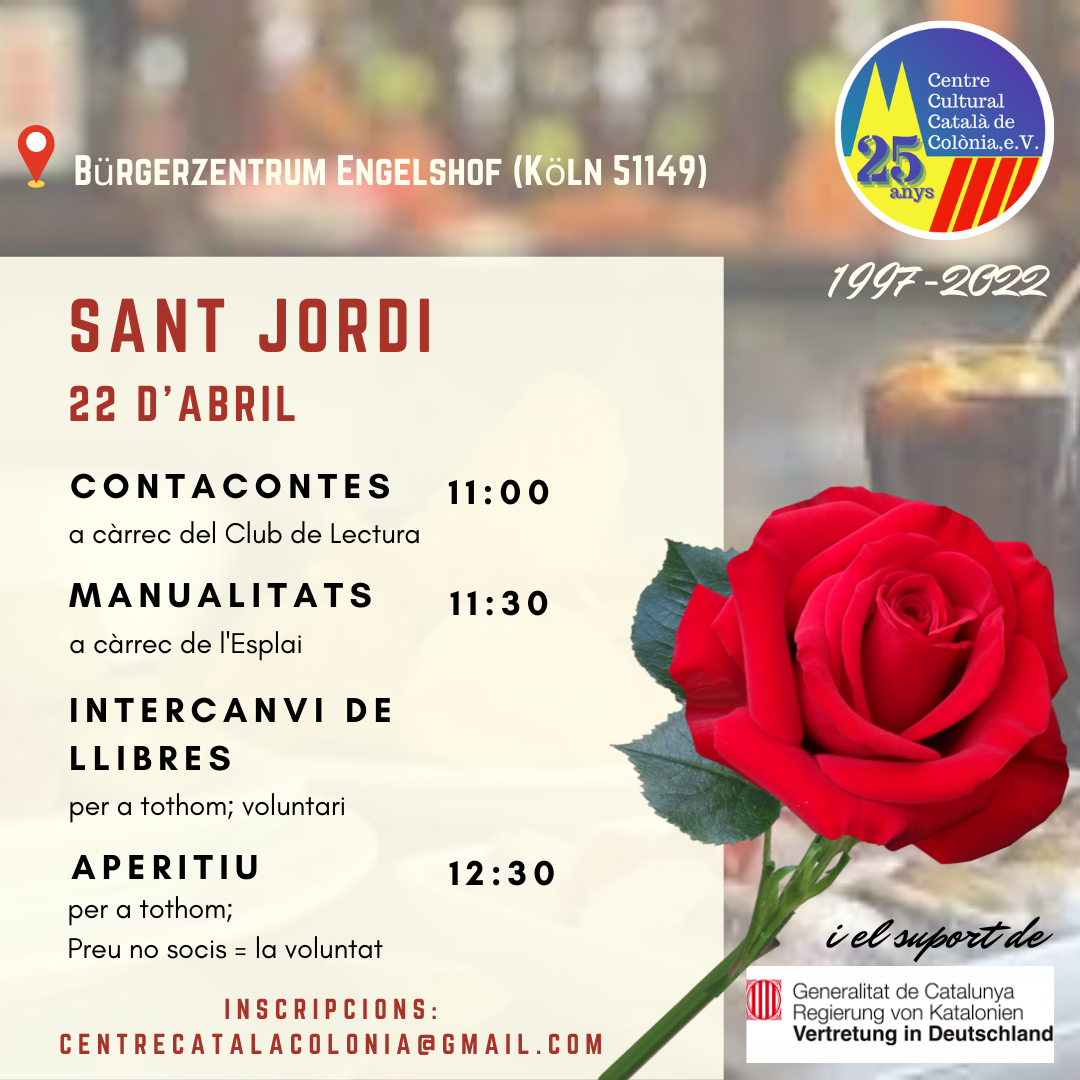 (RESERVEU-VOS LA DATA! Aquest 26 d'abril us convidem a celebrar Sant Jordi a Brussel·les a la Casa de la Gent Gran de la ULB! Estem preparant un programa farcit d’activitats per a viure plegats aquesta Diada tan especial. Aviat us informarem de tots els detalls sobre l’horari i les sorpreses que us hem preparat. Reserveu la data i estigueu atents a les pròximes comunicacions!)