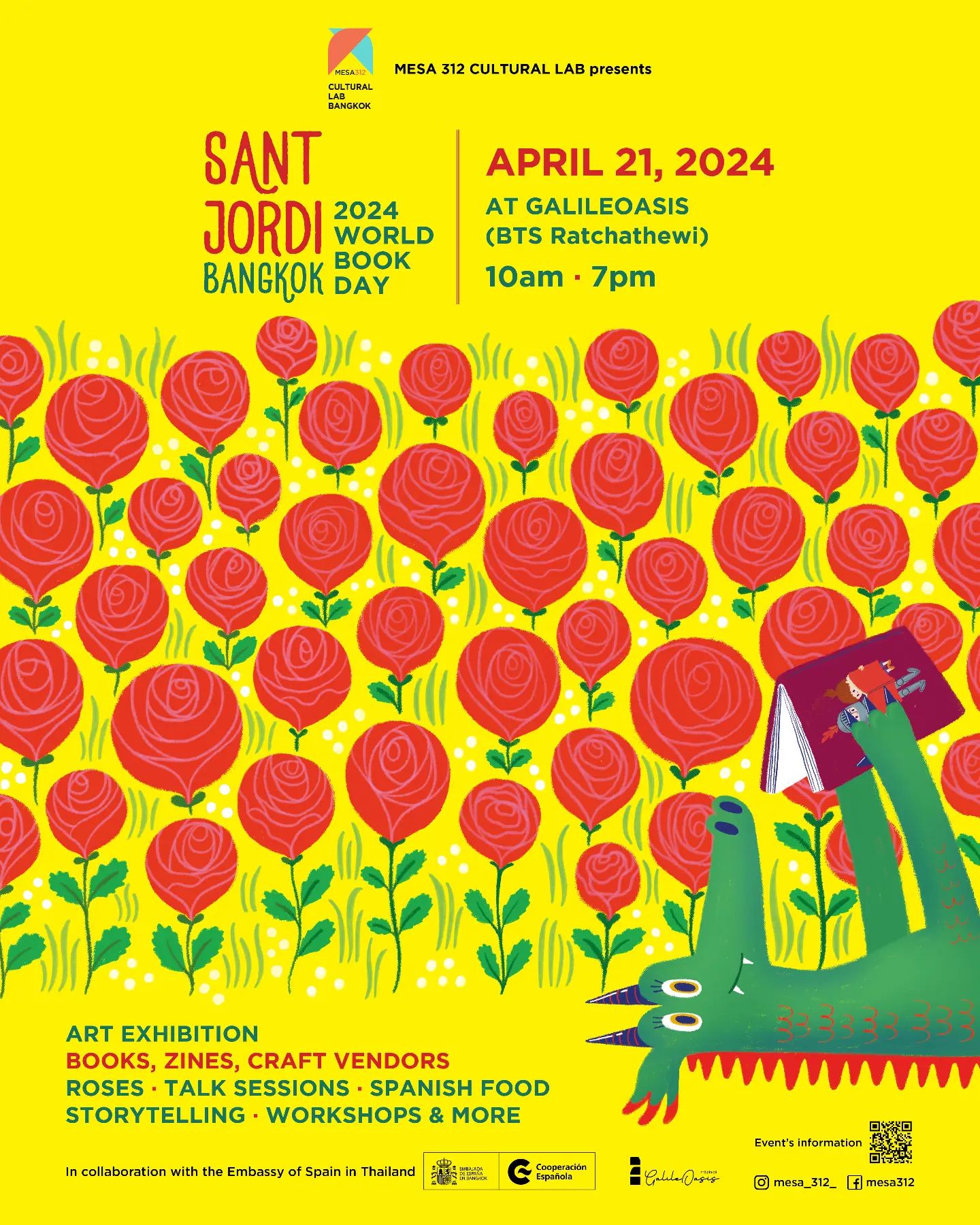 (#BooksAndRoses for the fourth consecutive year in Bangkok! Bookstores, publishers, and creators who publish in Thai, Spanish, or any other language will showcase their work on April 27th. Additionally there will be food and drink vendors and artists will also perform. Organized by Mesa 312 Cultural Lab in collaboration with the Embassy of Spain in Thailand. More information: https://www.instagram.com/p/DGNf3vHzWny/?img_index{=}1)